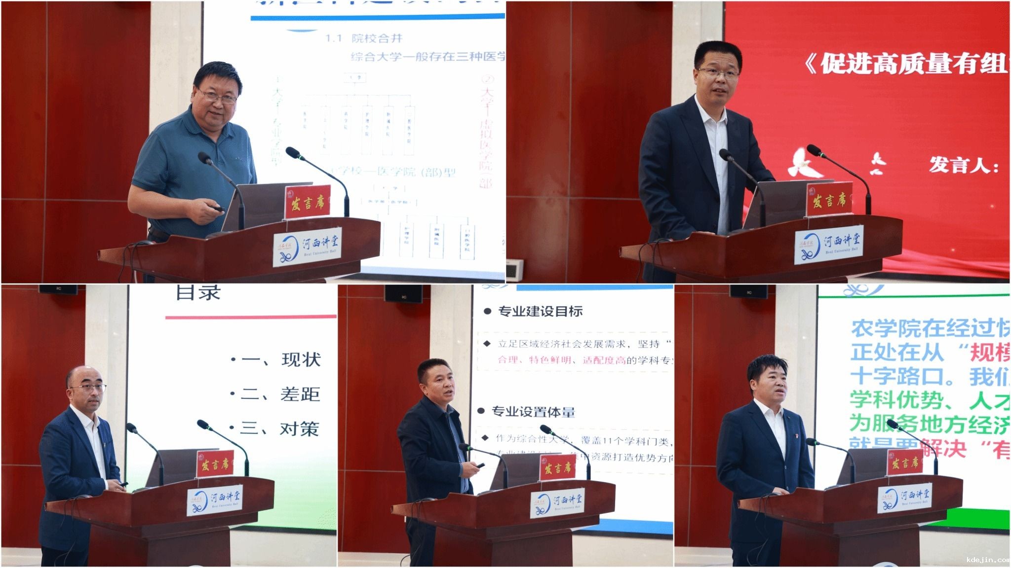 会上,党委常委、副校长赵柱,党委常委、副校长王国英,学科建设与研究生工作处处长贾小军,教务处处长杨彬,农业与生态工程学院院长马银山,分别结合分管领域和工作实际,围绕新医科建设、科研工作、学科建设、专业建设和发挥专业优势提升科技服务地方能力等方面,以《伟德国际1949官网登录医学本科教育十年总结反思及数智时代的发展路径思考》《促进高质量有组织科研工作的思考与实践路径》《以硕士点申报为抓手 优化学科结构 助力学校早日建成河西大学》《优化专业结构 深挖区位优势 突出办学特色——伟德国际1949官网登录本科专业建设思考》《破题学科产业 立新融合发展 关于学院当前核心问题与未来发展战略的思考》为题,作了交流发言。