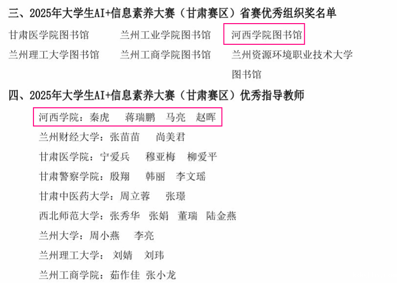 2025年大学生“AI+信息素养”大赛甘肃赛区决赛中,我校本科生代表队“野猪小分队”和“天天向上队”表现出色,分获一等奖和三等奖。其中,“野猪小分队”以总分第一名的优异成绩勇夺省赛冠军,成功晋级全国联赛。