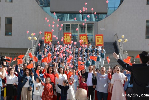 伴随着《我和我的祖国》熟悉的旋律,悠扬的小提琴声音响起,同学们不由自主的驻足观望,继而快步走来加入行列,情不自禁的载歌载舞放声歌唱,拿着一面面小国旗随着音乐的节奏而挥动。每一位同学的脸上都洋溢着深深的自豪,为伟大祖国的繁荣富强而感到骄傲,用自己的行动和歌声表达对祖国的祝福和热爱。
