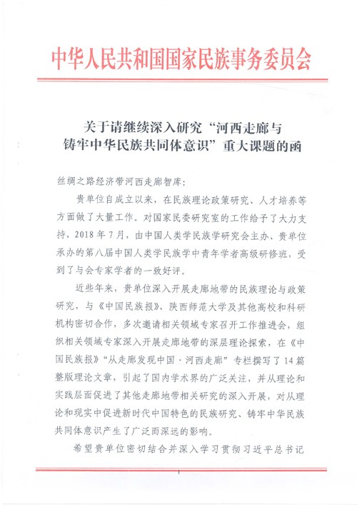 近日,国家民委致函学校,对我校丝绸之路经济带河西走廊智库的总体工作给予充分肯定,并就继续深入开展“河西走廊与铸牢中华民族共同体意识”等重大问题的研究做出重要批示。这是我校智库工作首次得到国家部委的肯定,对进一步提升学校影响力、推动智库工作和相关领域的科学研究起到积极的促进作用。