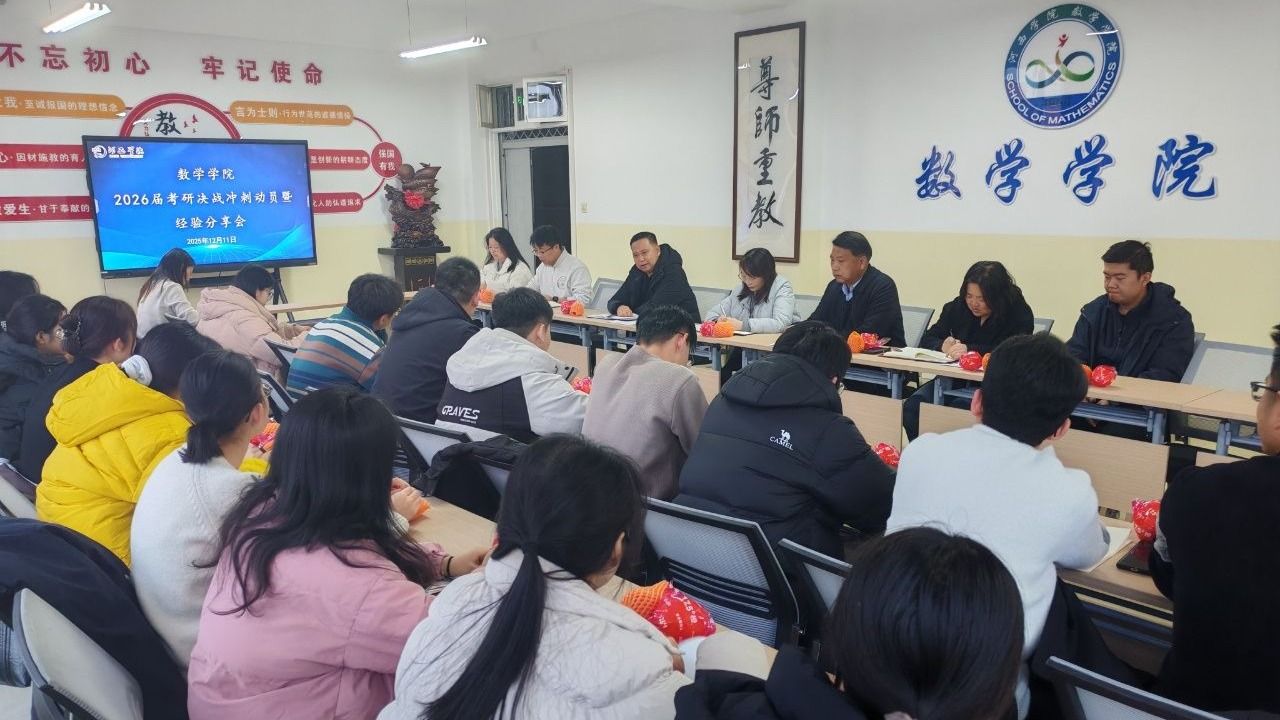 12月11日,数学学院举行2026届考研决战冲刺动员暨经验分享会。学院负责人、教师代表、辅导员与2026届考研生参会,会议由学院党委负责人主持。
