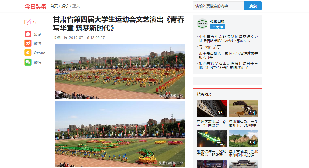 7月16日,甘肃省第四届大学生运动会开幕式大型文艺演出《青春写华章,筑梦新时代》在全场观众的欢呼声中拉开序幕。整场演出演职人员达3700多人,时长40分钟,由五个版块构成。第一版块“河西情深迎嘉宾”,以旗舞为表演形式,通过队列信号表演和队伍造型变化,借用马赛克动图元素,体现动画特色。第二版块是“在这永远年轻的地方”,以女子群舞、第二课堂情景表演为表现形式,原创歌曲《在这永远年轻的地方》为主题音乐,穿插多种队形变换的形式展示,以多彩的球类表演为主,包括足球、篮球、羽毛球、跳绳等以运动和体育舞蹈的形式展示校园、青春、唯美、朝气。第三版块“激情舞动校园风”,以广场舞为主,加入裕固族、蒙古族、藏族等舞蹈素材,展示团结、快乐,励志。第四版块是“更高更强,拥抱阳光”,表现武术、啦啦操展示体育竞技,武术铿锵有力、气势宏大、精壮神足,啦啦操张扬热烈、充满朝气蓬勃的精神力量。第五版块“青春追梦新时代”,以原创歌曲《青春追梦新时代》作为本届主题歌,进行歌舞表演,其中穿插展示本地人文特色的图案变化。整场演出凸显了陇原大地蓬勃发展的新面貌,表现了谦逊自廉的大学精神与风骨,展现缤纷多彩的大学校园以及当代大学生激情飞扬、追求理想、积极进取的时代精神。( 董兴平 张渊 安维民 李凯 摄)