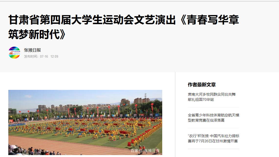7月16日,甘肃省第四届大学生运动会开幕式大型文艺演出《青春写华章,筑梦新时代》在全场观众的欢呼声中拉开序幕。整场演出演职人员达3700多人,时长40分钟,由五个版块构成。第一版块“河西情深迎嘉宾”,以旗舞为表演形式,通过队列信号表演和队伍造型变化,借用马赛克动图元素,体现动画特色。第二版块是“在这永远年轻的地方”,以女子群舞、第二课堂情景表演为表现形式,原创歌曲《在这永远年轻的地方》为主题音乐,穿插多种队形变换的形式展示,以多彩的球类表演为主,包括足球、篮球、羽毛球、跳绳等以运动和体育舞蹈的形式展示校园、青春、唯美、朝气。第三版块“激情舞动校园风”,以广场舞为主,加入裕固族、蒙古族、藏族等舞蹈素材,展示团结、快乐,励志。第四版块是“更高更强,拥抱阳光”,表现武术、啦啦操展示体育竞技,武术铿锵有力、气势宏大、精壮神足,啦啦操张扬热烈、充满朝气蓬勃的精神力量。第五版块“青春追梦新时代”,以原创歌曲《青春追梦新时代》作为本届主题歌,进行歌舞表演,其中穿插展示本地人文特色的图案变化。整场演出凸显了陇原大地蓬勃发展的新面貌,表现了谦逊自廉的大学精神与风骨,展现缤纷多彩的大学校园以及当代大学生激情飞扬、追求理想、积极进取的时代精神。