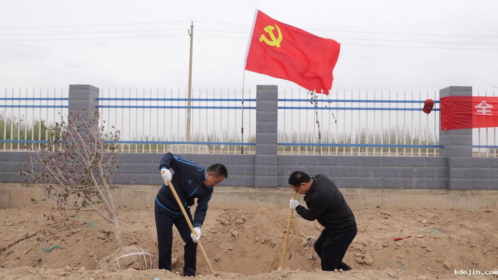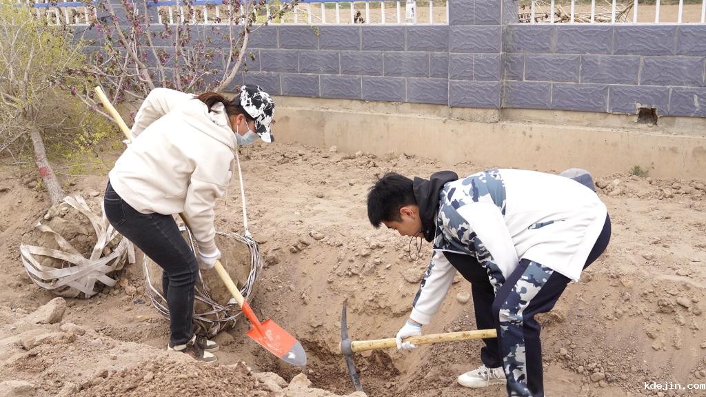 植树现场,微风拂面,党旗飘扬,一师一生结成对子挥锹植绿。师生们精神饱满、分工协作、密切配合,严格按照植树技术规范要求,开沟、挖坑、放苗、扶正、培土、压实、灌水,栽种下了一棵棵树苗,并在所种树苗上悬挂了师生共同签名的“认栽认养”标牌。同时,对枯枝杂草、垃圾杂物等进行排查清理。每个步骤都井然有序、细致认真,配合默契,体现了“爱生如子、爱校如家”和教学相长、踔厉奋发的精神和情怀。胸前的党徽熠熠生辉,脸颊的汗水粒粒可数,师生们以自己的实际行动奏响了爱绿植绿护绿的青春乐章。