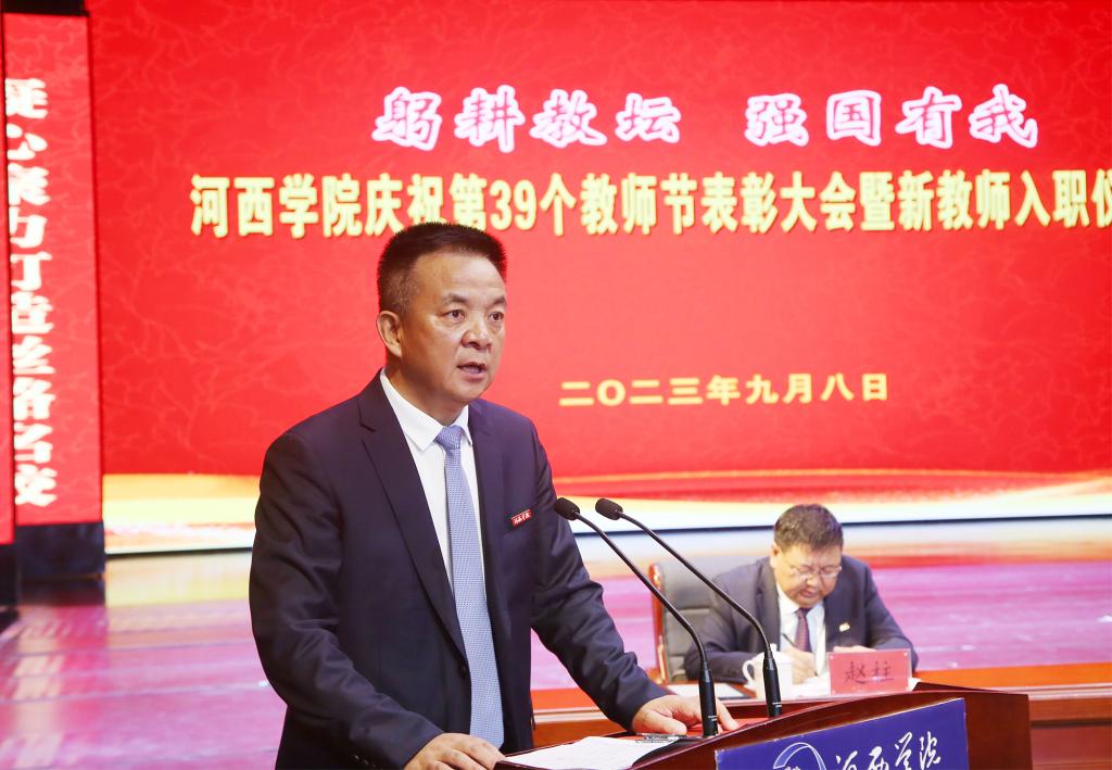 庆祝大会在雄壮的国歌声中拉开帷幕。党委书记梁兆光为2023年度甘肃省高等学校教学名师获得者颁奖。校领导、党委常委分别为荣获伟德国际1949官网登录2023年度“优秀教师”“教育工作先进个人”的代表颁奖,为专业学位硕士研究生导师代表颁发聘书。校领导、党委常委为从事教育教学工作满30年的教师代表颁发荣誉证书,同学们为老师献花。三位教师代表做了交流发言。