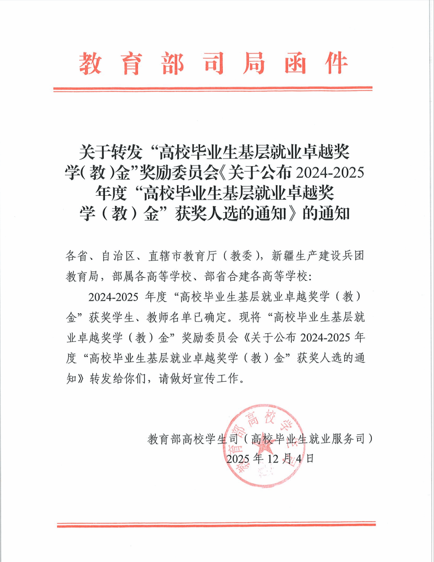 近日,2024-2025年度“高校毕业生基层就业卓越奖学(教)金”获奖名单正式公布,我校毕业生孔令录名列其中。此前,我校毕业生胡毓莹、教师陈刚及毕业生唐振宇已先后荣获2022-2023年度、2023-2024年度该奖项。至此,学校已连续三年在这项国家级就业领域表彰中荣登榜单,充分彰显了学校在引导毕业生扎根基层、服务国家战略方面的扎实育人成效与鲜明办学特色。“高校毕业生基层就业卓越奖学(教)金”是在教育部高校学生司(高校毕业生就业服务司)...