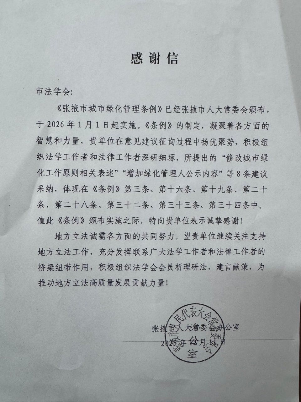 近日,张掖市法学会向法学院发来的感谢信,对法学院及于访勤副教授在《张掖市城市绿化管理条例(草案修改稿)》立法意见征集工作中的贡献表示感谢。在张掖市法学会组织的《张掖市城市绿化管理条例(草案修改稿)》征求意见座谈会上,于访勤老师与其他六位法学专家立足张掖实际,围绕条例内容,从四个维度共提出32条建设性意见,其中8条被正式采纳。该条例已由张掖市人大常委会审议通过,将于2026年1月1日起施行。张掖市法学会在感谢信中充分肯定了法学院在服务地方法治建设中所发挥的桥梁与智库作用,...
