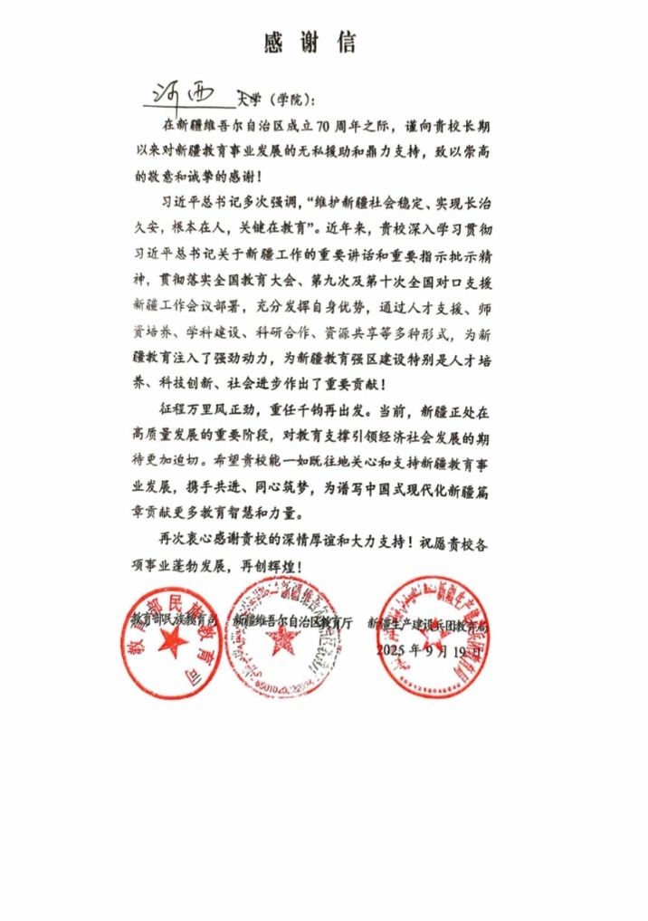 教育部民族教育司、新疆维吾尔自治区教育厅、新疆生产建设兵团教育局向伟德国际1949官网登录发来感谢信